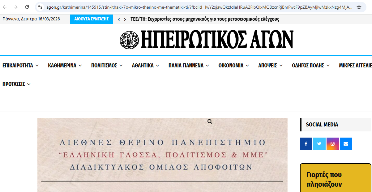 Στην Ιθάκη «7ο Μικρό Θερινό» με θεματική τη γλωσσική μεταβολή https://www.agon.gr/kathimerina/145915/stin-ithaki-7o-mikro-therino-me-thematiki-ti/?fbclid=IwY2xjawQkzfdleHRuA2FlbQIxMQBzcnRjBmFwcF9pZBAyMjIwMzkxNzg4MjAwODkyAAEeleiRBLGN_KKQPsmAneKR6iGnrmFHJkA8PYKV2dhdJ7v8OFHf6u8-fHAf9O4_aem_6e-NGpWytEepXxLIfvULOA: Στην Ιθάκη «7ο Μικρό Θερινό» με θεματική τη γλωσσική μεταβολή